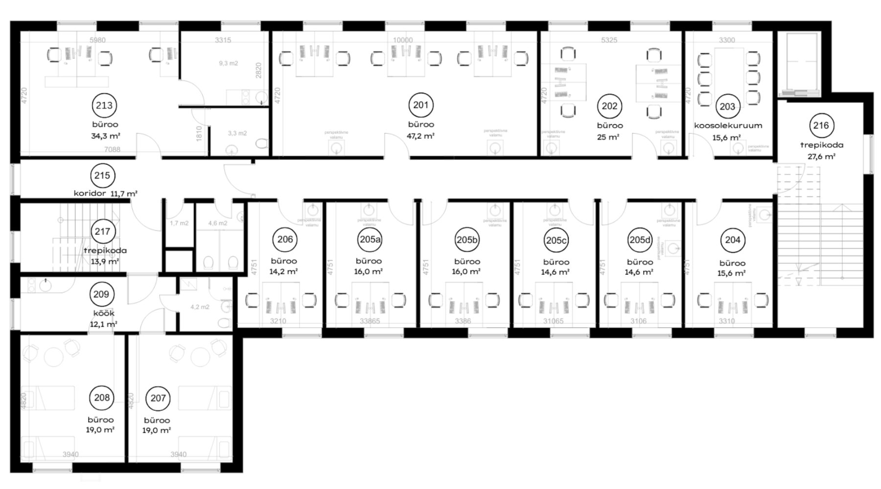 Ärimaja teisel korrusel paiknevad kuni 55 m² suurused kontoriruumid nii avatud kui suletud ruumilahendusega.